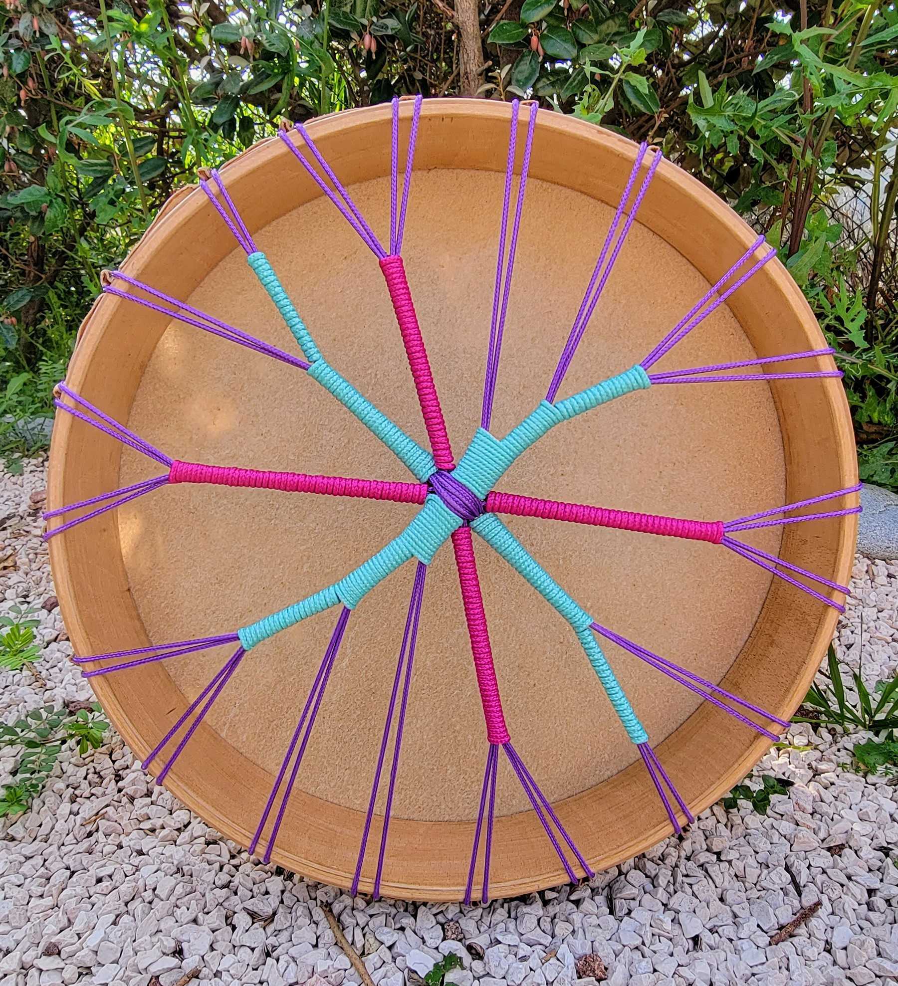 Les tambours peuvent être confectionnés sur commande. Tu as la liberté de choisir la taille, la peau, les couleurs des liens et les motifs du tissage.