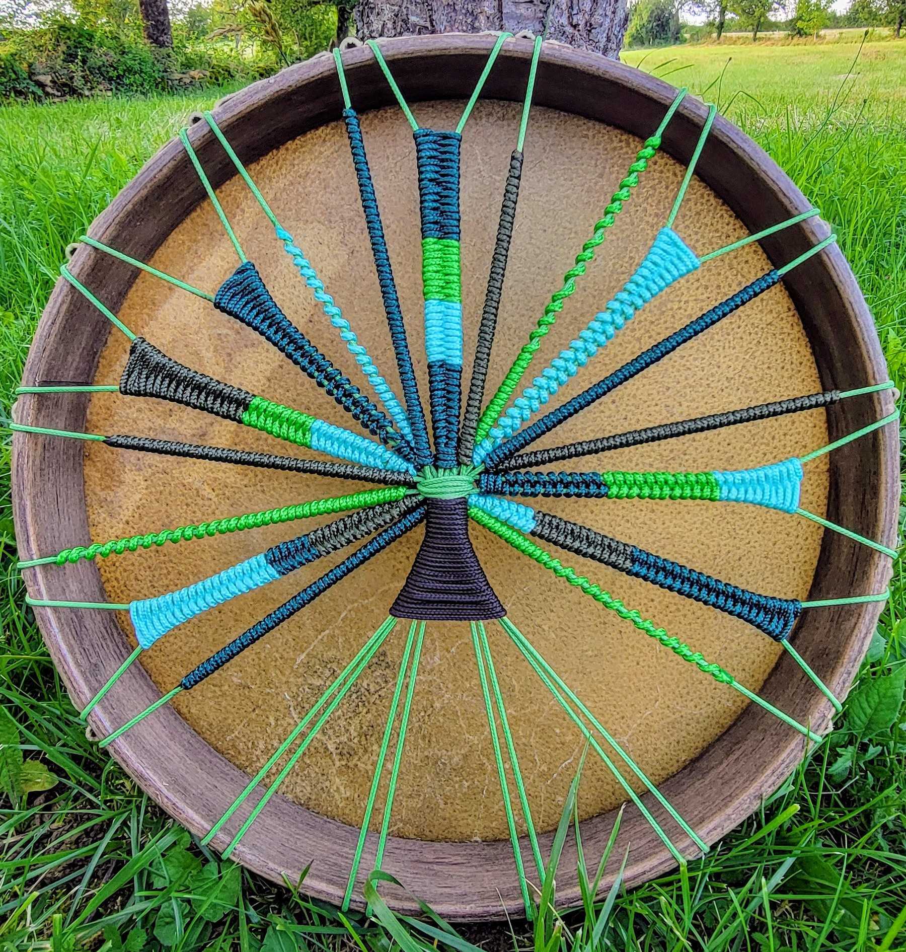 Les tambours peuvent être confectionnés sur commande. Tu as la liberté de choisir la taille, la peau, les couleurs des liens et les motifs du tissage.