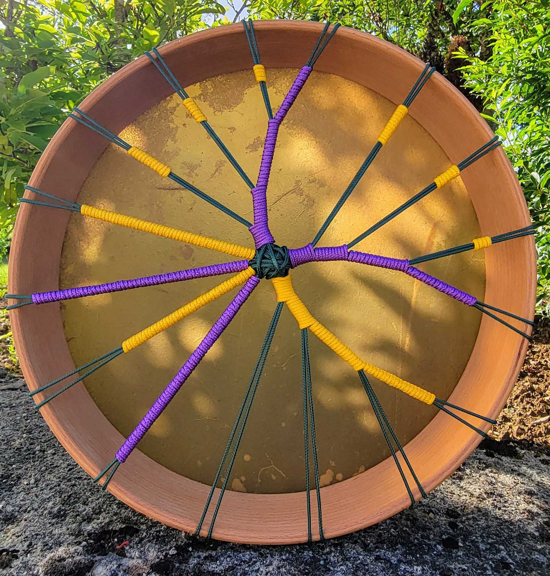 (Les énergies que je partage concernant la naissance de chaque tambour sont liées à mon ressenti personnel pendant leur créations. Cependant, ces tambours offrent bien plus ; c'est une connexion intime entre le tambour et son gardien. Ils réservent encore maintes surprises et offrent un potentiel infini d'expériences qui ne sont bien sûr pas limitées à ma propre interprétation.)