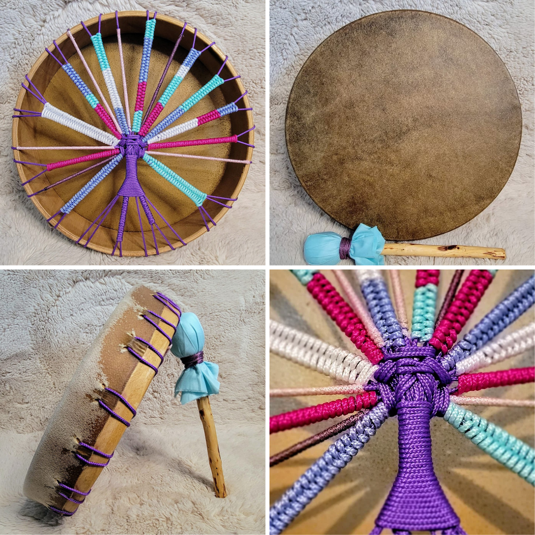 Les tambours peuvent être confectionnés sur commande. Tu as la liberté de choisir la taille, la peau, les couleurs des liens et les motifs du tissage.