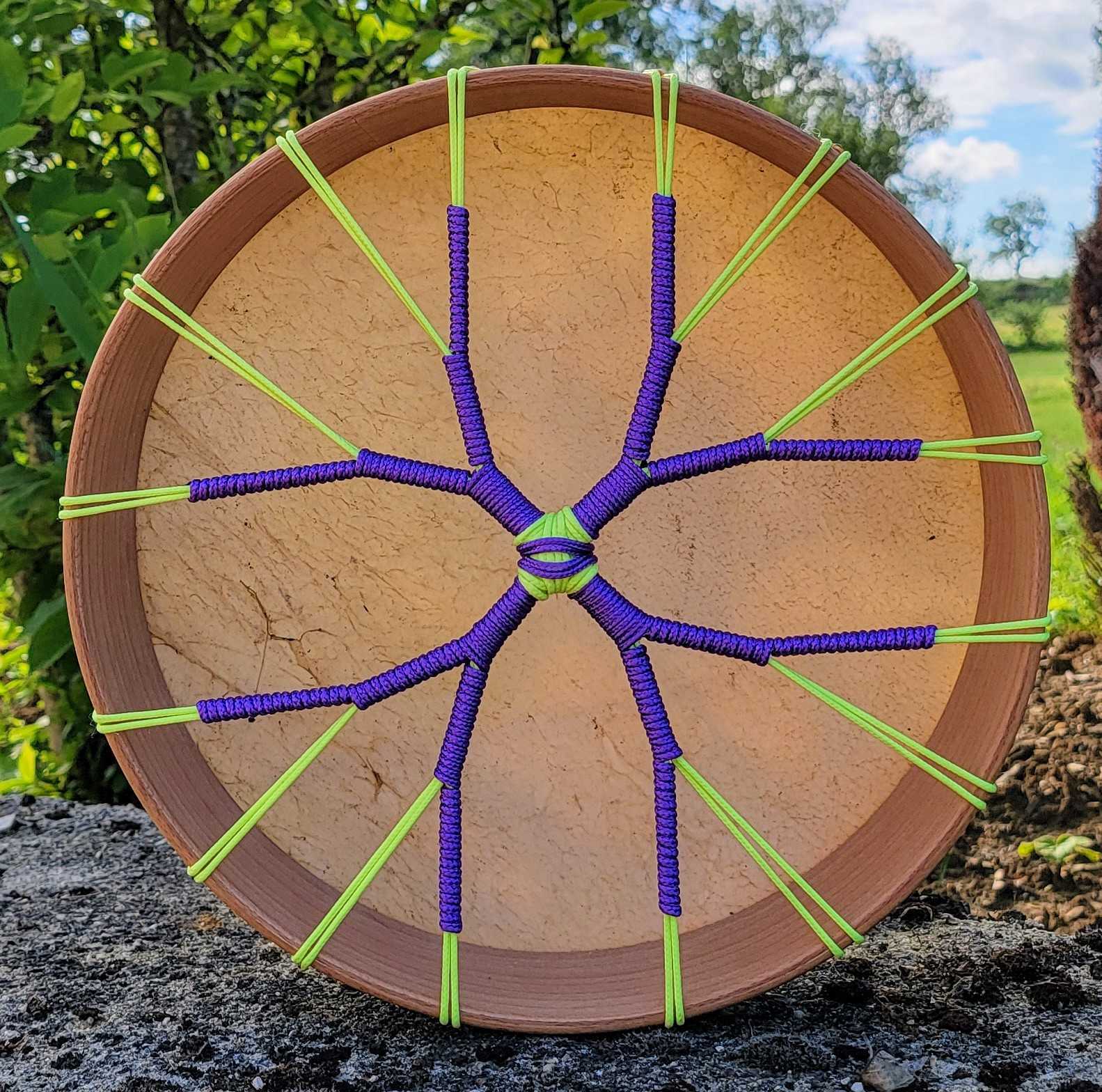 Grâce à la profondeur de son cerclage, les vibrations de ce tambour rebondissent magnifiquement sur le bois, créant une sonorité riche et profonde. Cette qualité sonore en fait un compagnon idéal pour des pratiques individuelles ou des soins énergétiques. Ses liens en jaune fluo et violet ajoutent une touche de luminosité et de dynamisme, symbolisant l'équilibre entre la joie et la spiritualité.