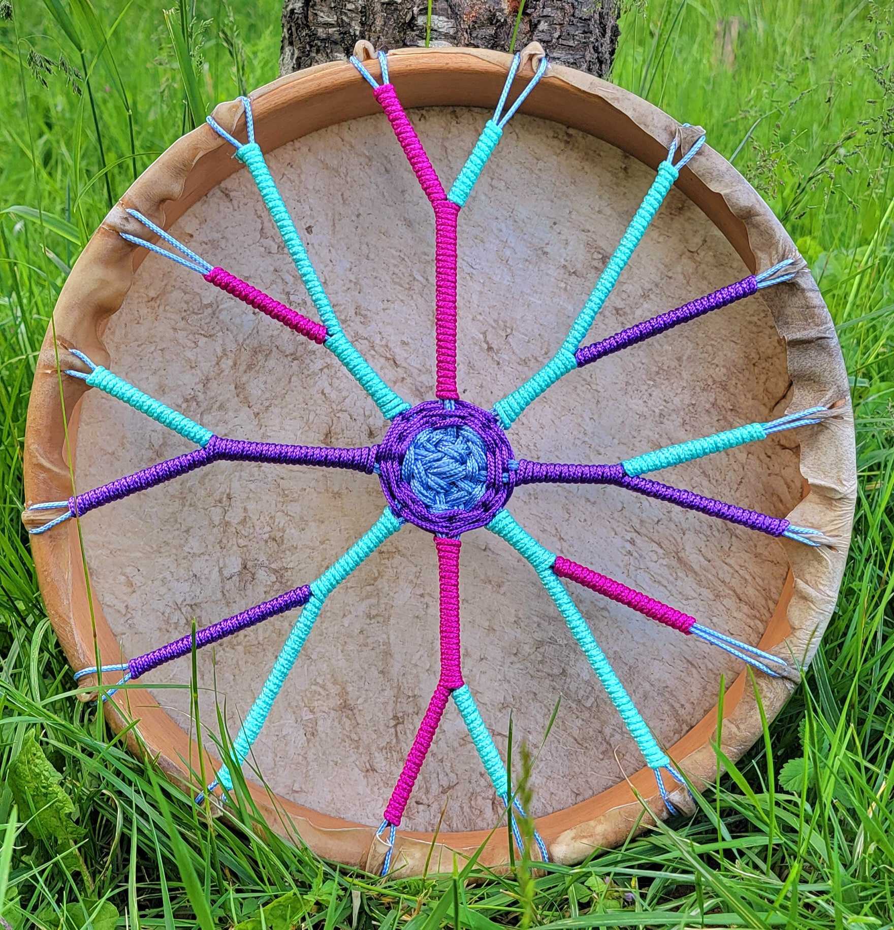 Les tambours peuvent être confectionnés sur commande. Tu as la liberté de choisir la taille, la peau, les couleurs des liens et les motifs du tissage.