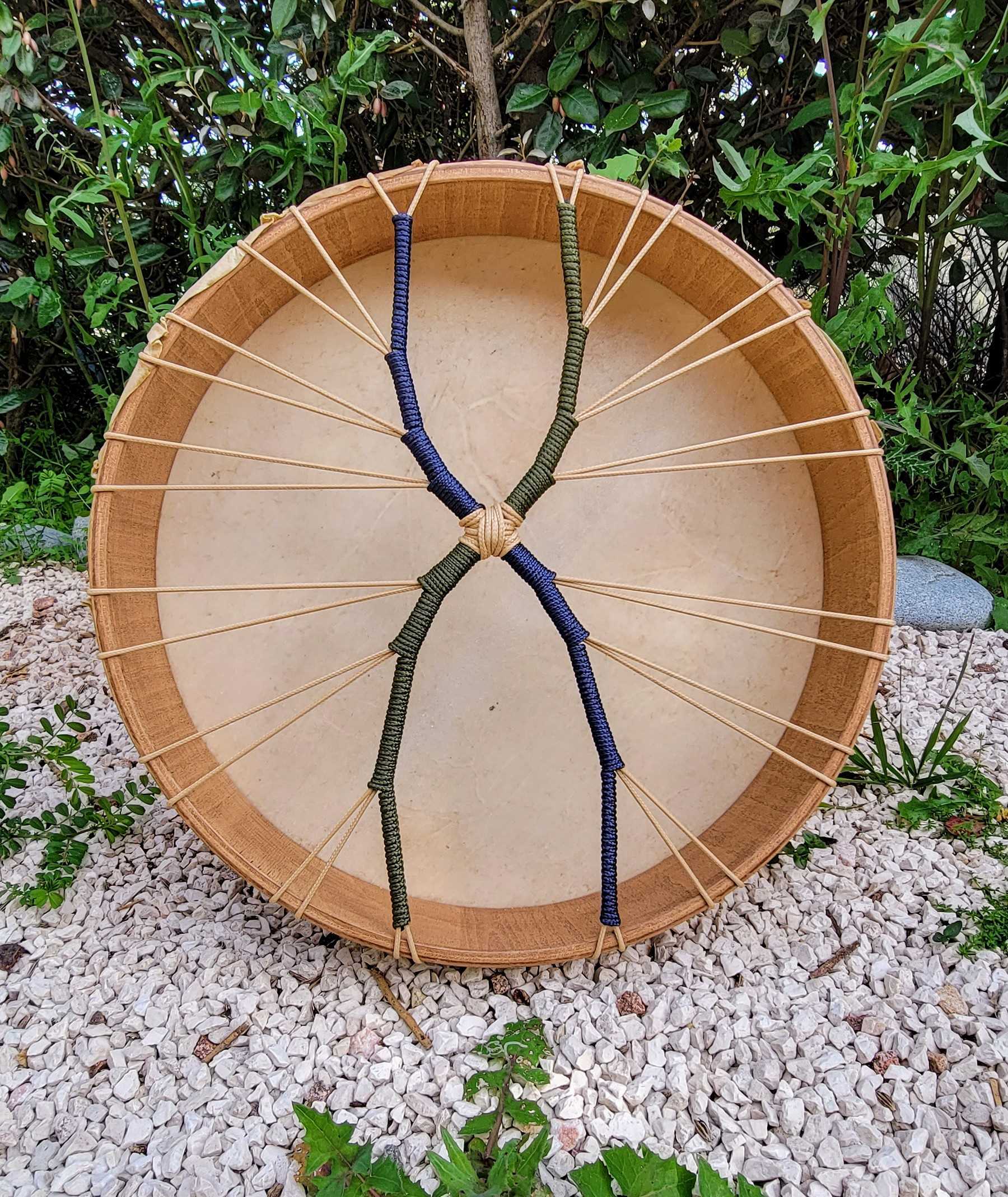 Les tambours peuvent être confectionnés sur commande. Tu as la liberté de choisir la taille, la peau, les couleurs des liens et les motifs du tissage.