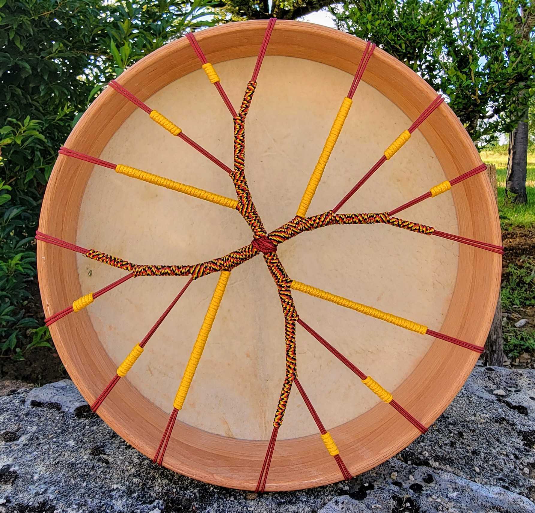 Les tambours peuvent être confectionnés sur commande. Tu as la liberté de choisir la taille, la peau, les couleurs des liens et les motifs du tissage.