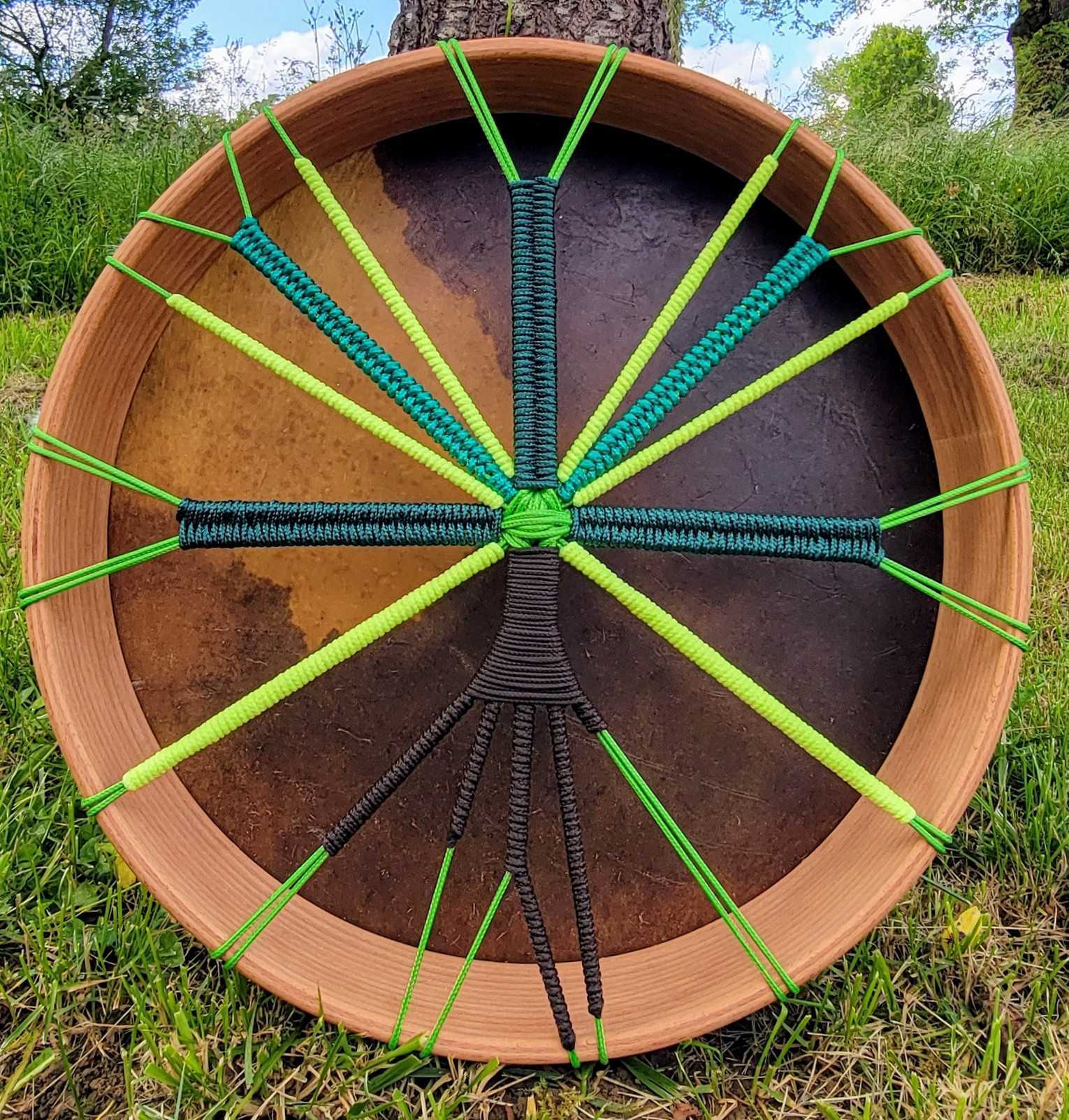 Le tissage lumineux de ce tambour, orné d'un motif d'arbre et de cordages en vert, jaune et brun, évoque la joie et l'harmonie. Les couleurs vibrantes ajoutent une dimension visuelle à l'instrument, renforçant l'énergie joyeuse et créative du tambour.